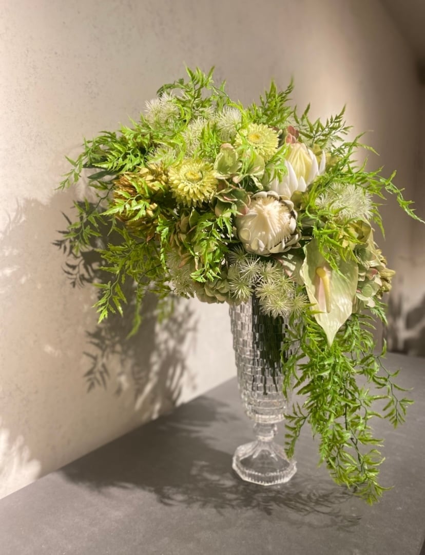 美しい淡いグリーンのアンスリウムとプロテアが見事に組み合わさったアーティフィシャルフラワーアレンジメントです。高さ80㎝、横幅60㎝、奥行45㎝の存在感あるサイズは、お部屋のどの場所でも特別な雰囲気を演出し、インテリアのアクセントとしても最適です。ガラスの花器も付属しているため、すぐにお部屋を彩ることができます!