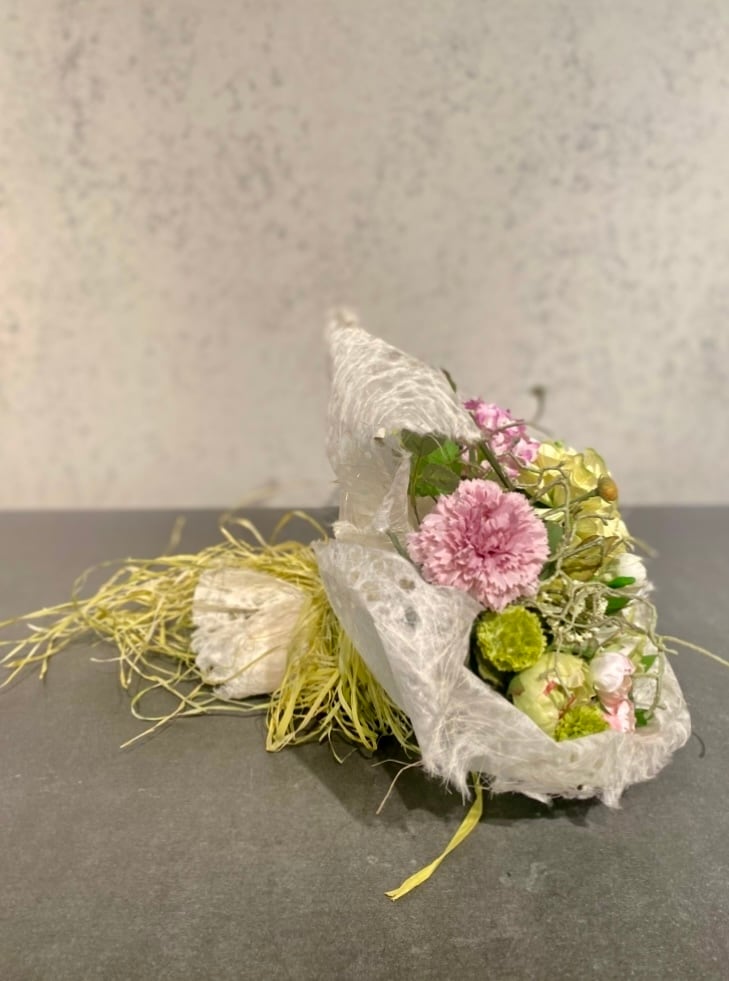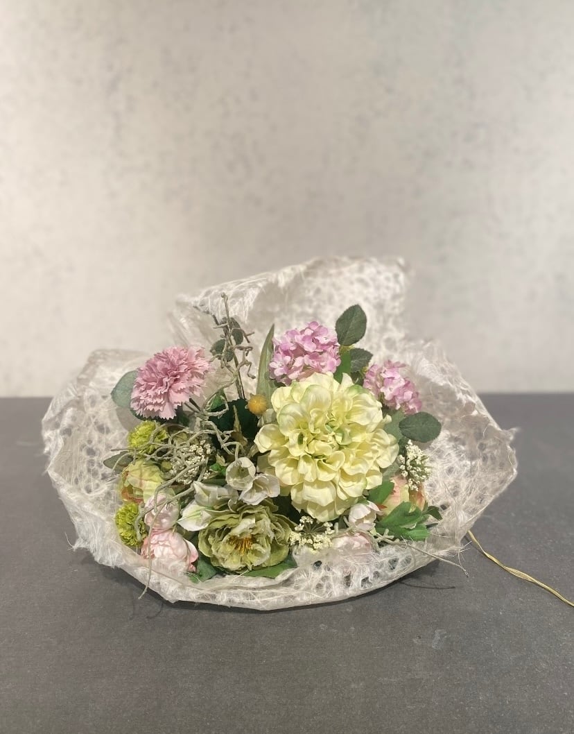 白いカーネーションをメインに使用した、春を感じる優しいブーケのアーティフィシャルフラワーアレンジメントです。縦28㎝、横幅30㎝、奥行25㎝のサイズは、どんなお部屋にもぴったりで、特別な雰囲気をプラスします。和紙のようなラッピングペーパーで仕上げられており、見た目にも美しく、贈り物にも最適です。